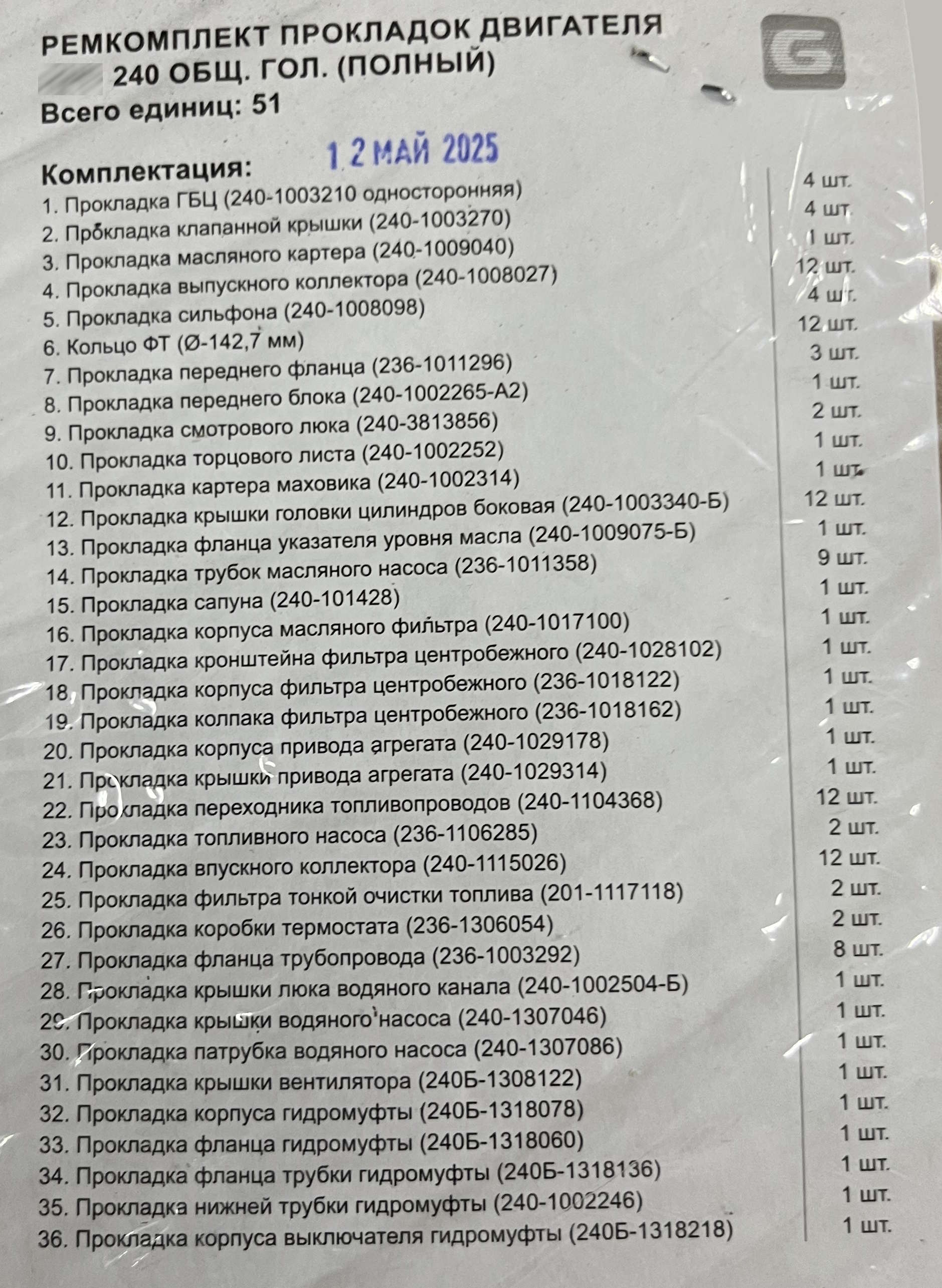 К-т прокладок двигателя (полный) 240 (общая головка)