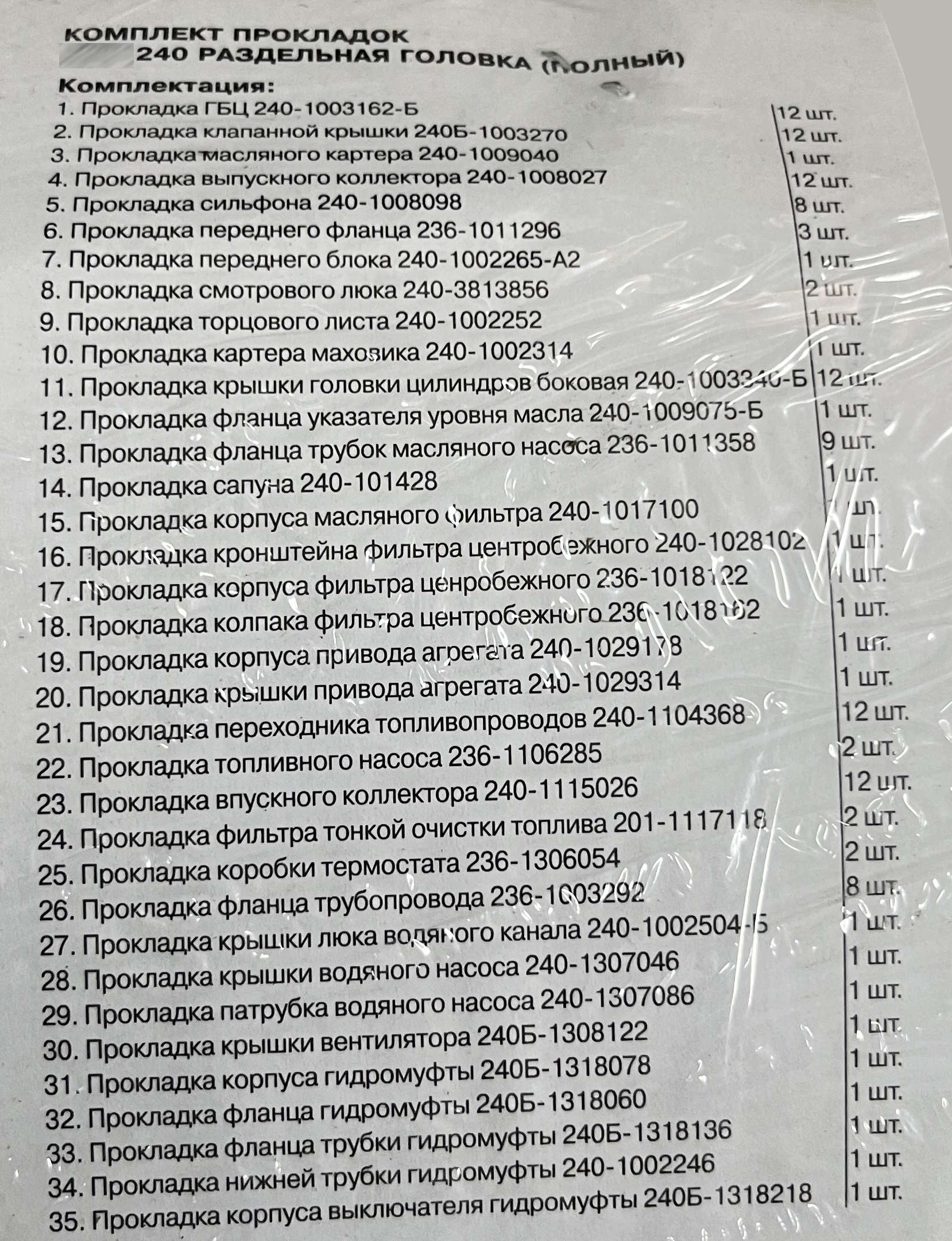 Включает в себя все паронитовые и резиновые прокладки для 12 цилиндрового 240 ярославского двигателя с раздельными ГБЦ